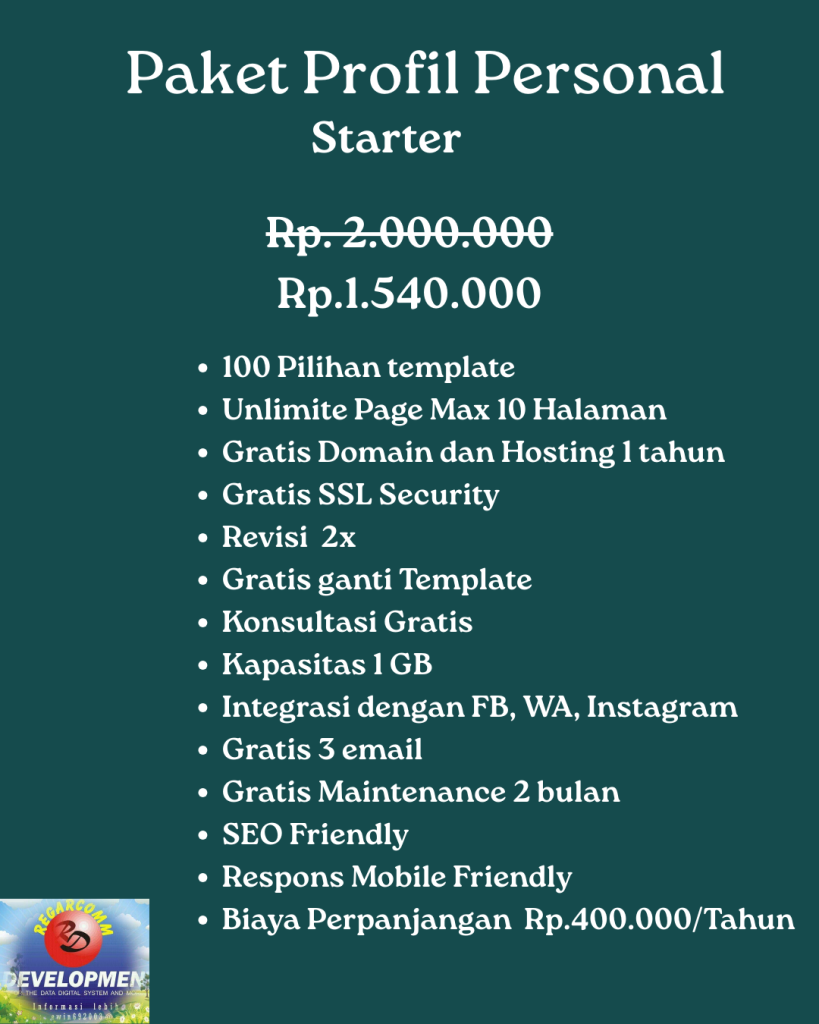 Paket Profil Personal Starter adalah pilihan yang sempurna bagi mereka yang ingin memiliki situs web yang interaktif dan mudah digunakan. Paket ini terdiri dari tiga halaman yang dirancang dengan sangat baik, sehingga memudahkan pribadi menampilkan portofolio personal dan berinteraksi dengan pengunjung mereka.